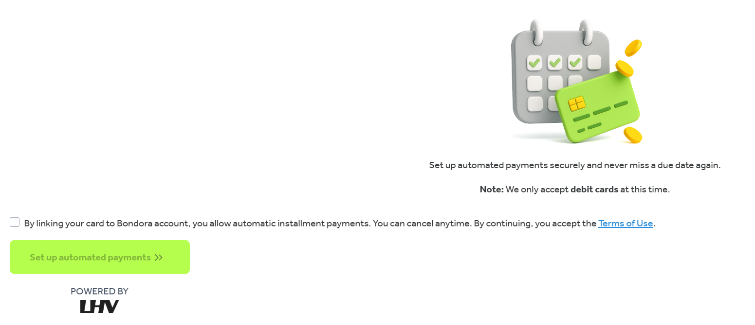“By linking your card to Bondora account, you allow automatic installment payments. You can cancel anytime. By continuing, you accept the Terms of Use.”
