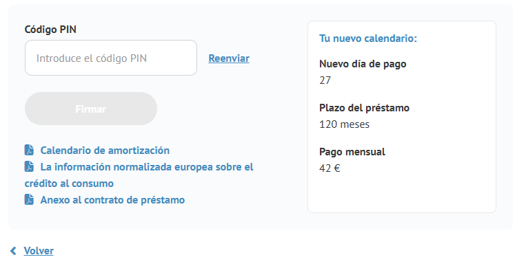 Para ver una versión detallada, haz clic en Firmar y en la siguiente pantalla selecciona Calendario de pagos para descargar y revisar el PDF.